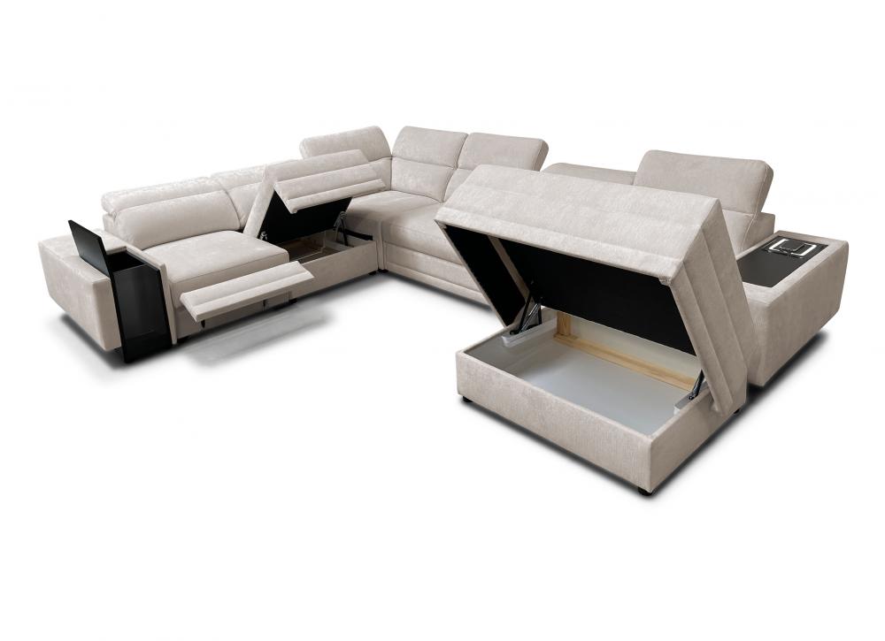 - narożnik z funkcjonalnym szezlongiem – pufa na zaczepy "krokodylki" pozwala stworzyć leżankę lub służy jako osobne siedzisko, z możliwością schowania zaczepów pod mebel.
