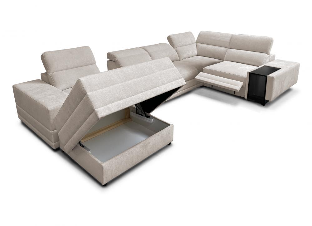 - narożnik z funkcjonalnym szezlongiem – pufa na zaczepy "krokodylki" pozwala stworzyć leżankę lub służy jako osobne siedzisko, z możliwością schowania zaczepów pod mebel.