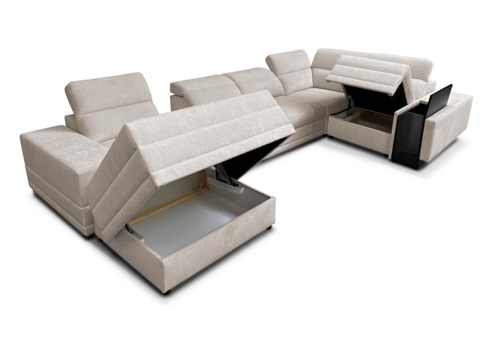 - narożnik z funkcjonalnym szezlongiem – pufa na zaczepy "krokodylki" pozwala stworzyć leżankę lub służy jako osobne siedzisko, z możliwością schowania zaczepów pod mebel.