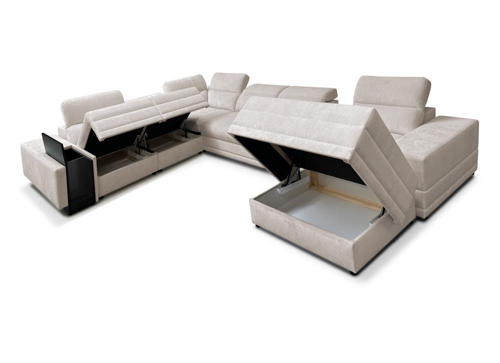 - narożnik z funkcjonalnym szezlongiem – pufa na zaczepy "krokodylki" pozwala stworzyć leżankę lub służy jako osobne siedzisko, z możliwością schowania zaczepów pod mebel.